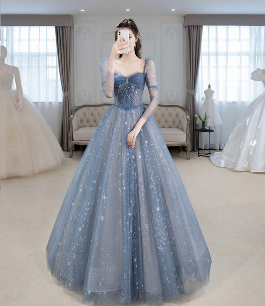 Blue tulle beads long prom dress A line evening gown fg483