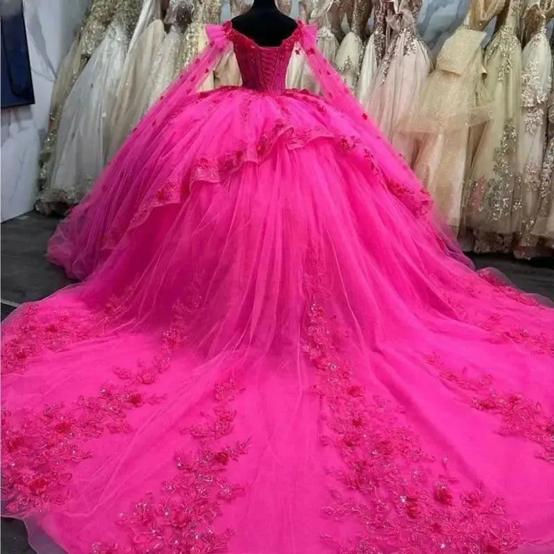 3D Flower Appliques Quinceanera Dresses Luxury Beads Cape Sleeve Prom Ball Gowns Puffy Princess Dress fg7503