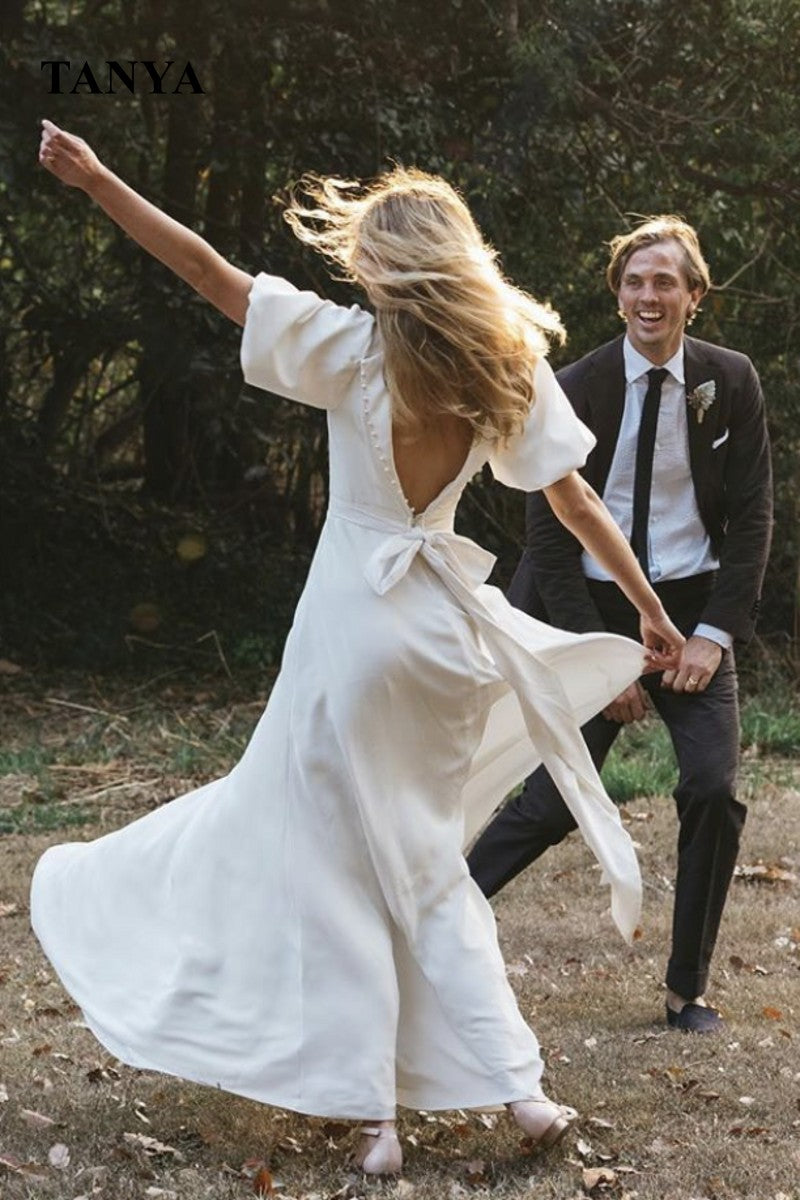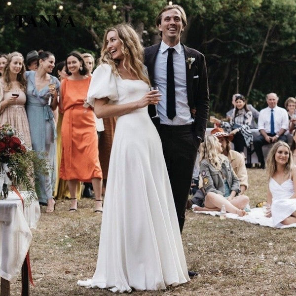A Line Wedding Dress Long Square Neck Lantern Sleeves V Back Pearls Soft Satin Bridal Dresses fg3300