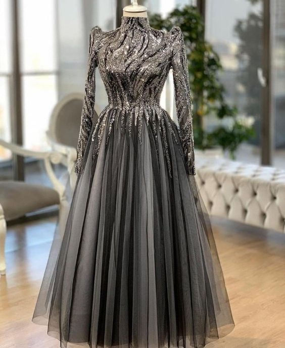 Black prom dresses high neck long sleeve a line evening dresses fg2919