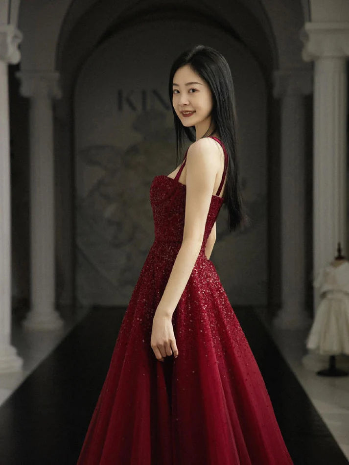 Burgundy Prom Dresses A line Straps Tulle Evening Dresses fg6734