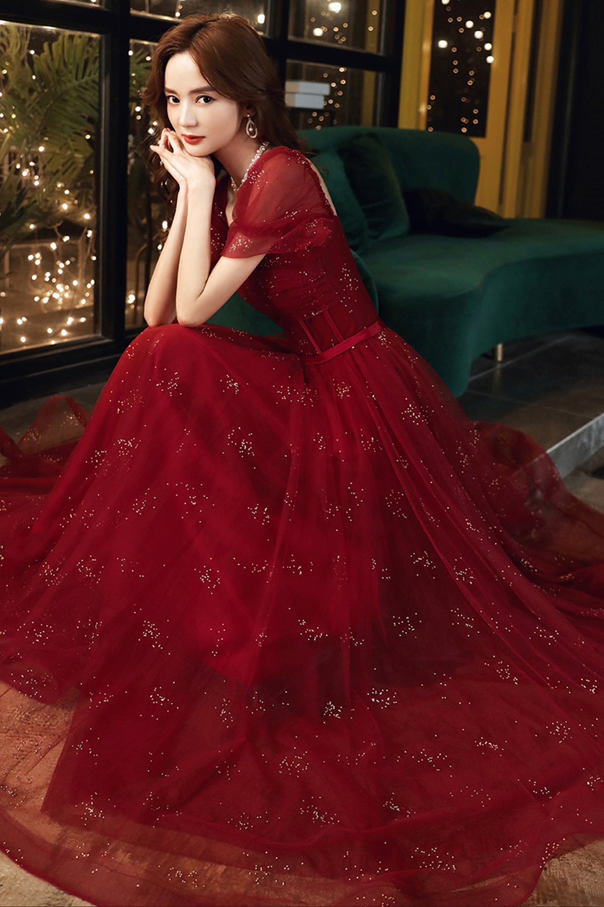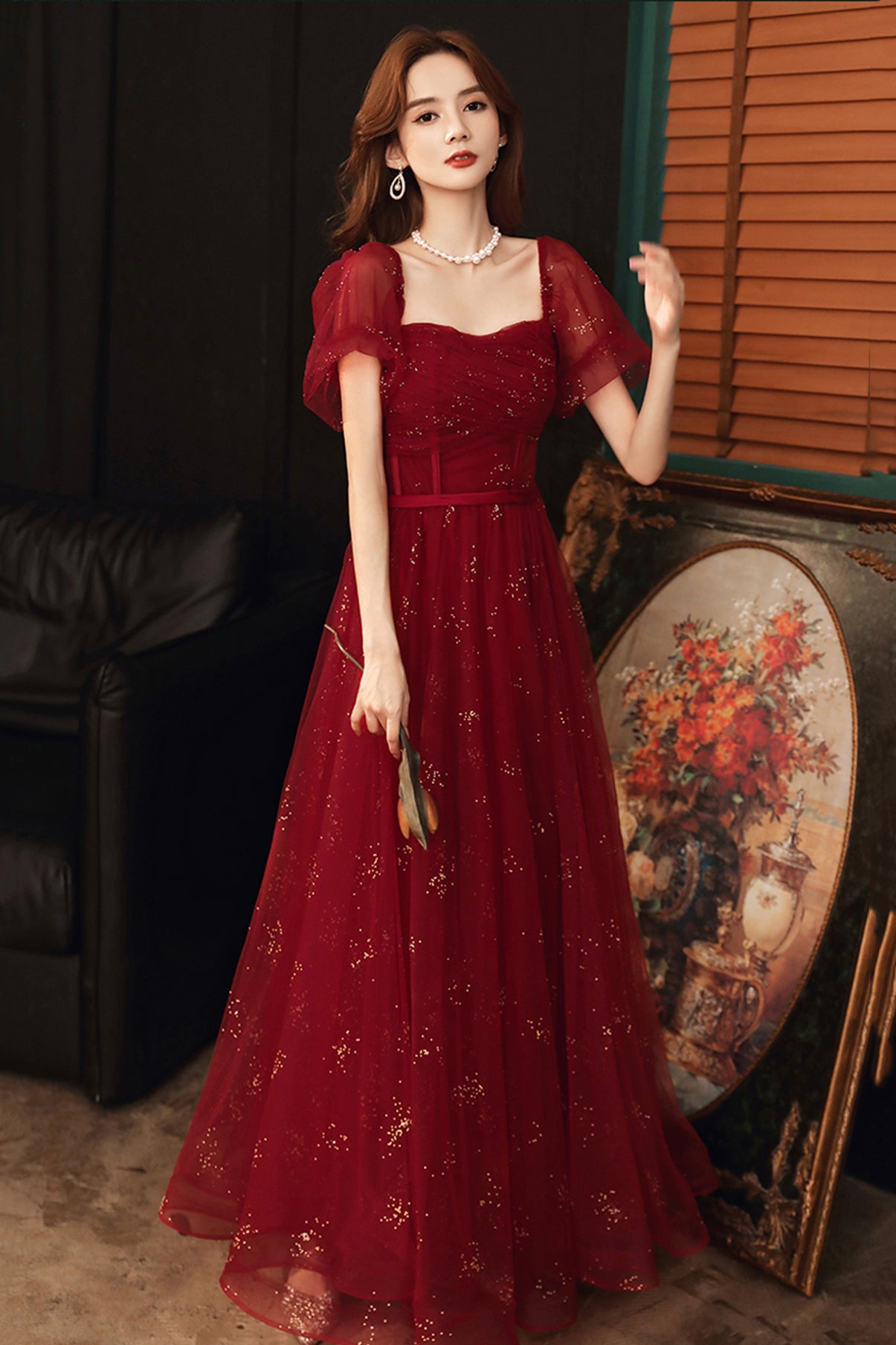 Burgundy Tulle Sequins Long A Line Prom Dress Evening Dress fg4234