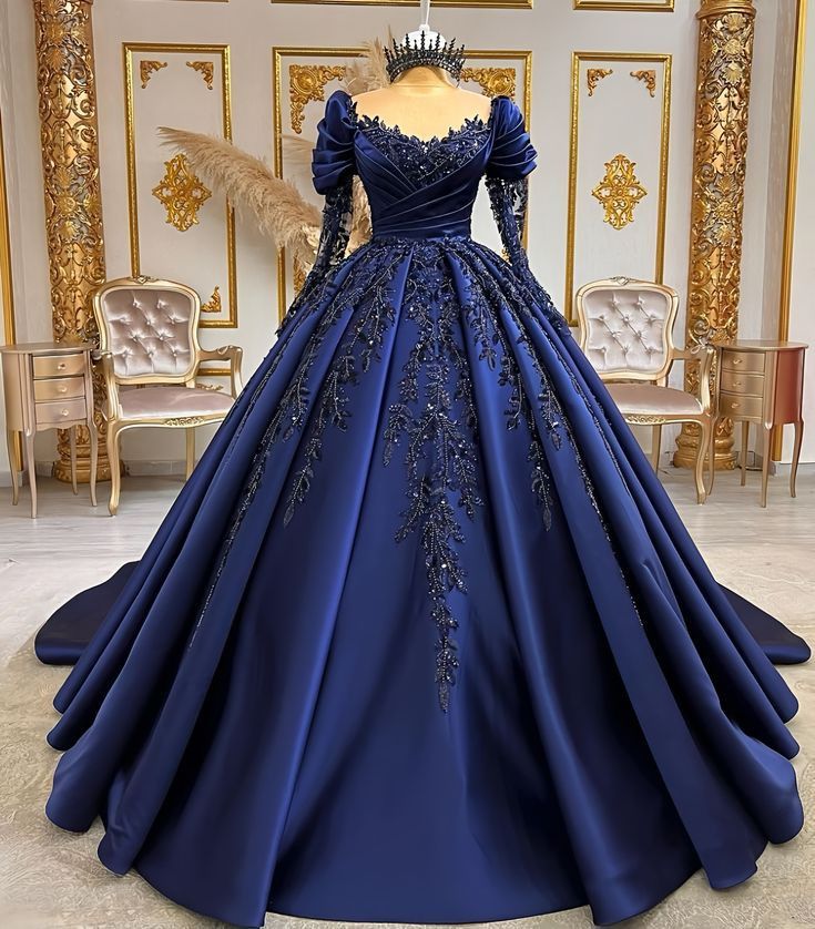 Elegant Navy Blue O-Neck Sequined Appliques Long Sleeves Quinceanera Evening Dress Ball Gown Floor Length Princess Prom Dress fg6858