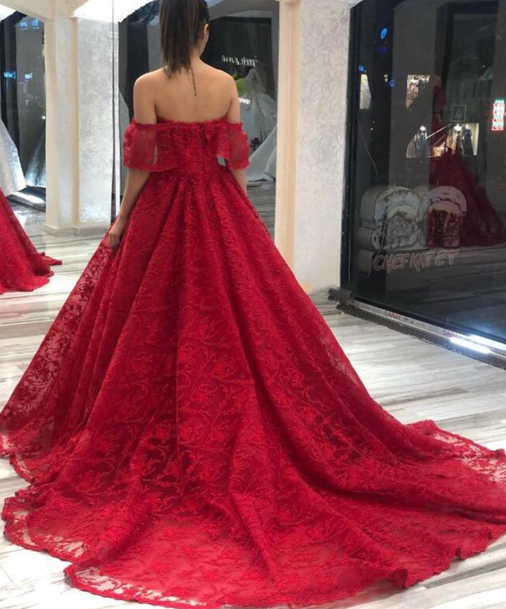 Off The Shoulder Lace Long Prom Dresses Chapel Train Party Dresses fg1653