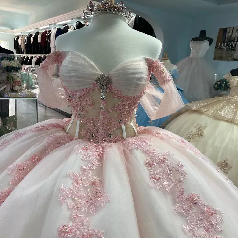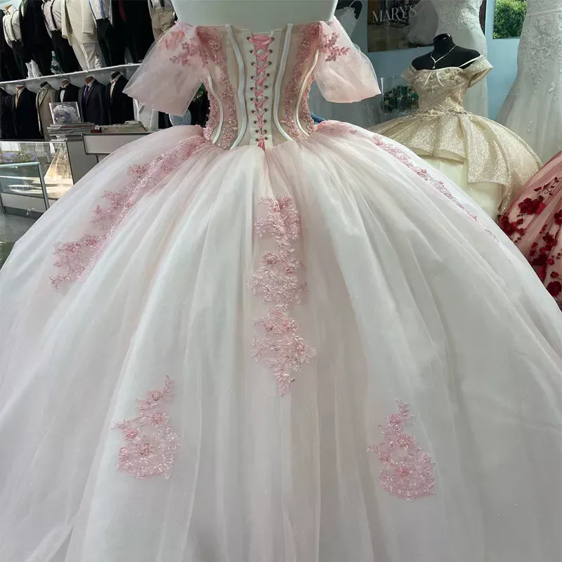 Pink Lace Quinceanera Dress Ball Gown Applique Lace Tulle Party Sweet 16 Dress fg7352