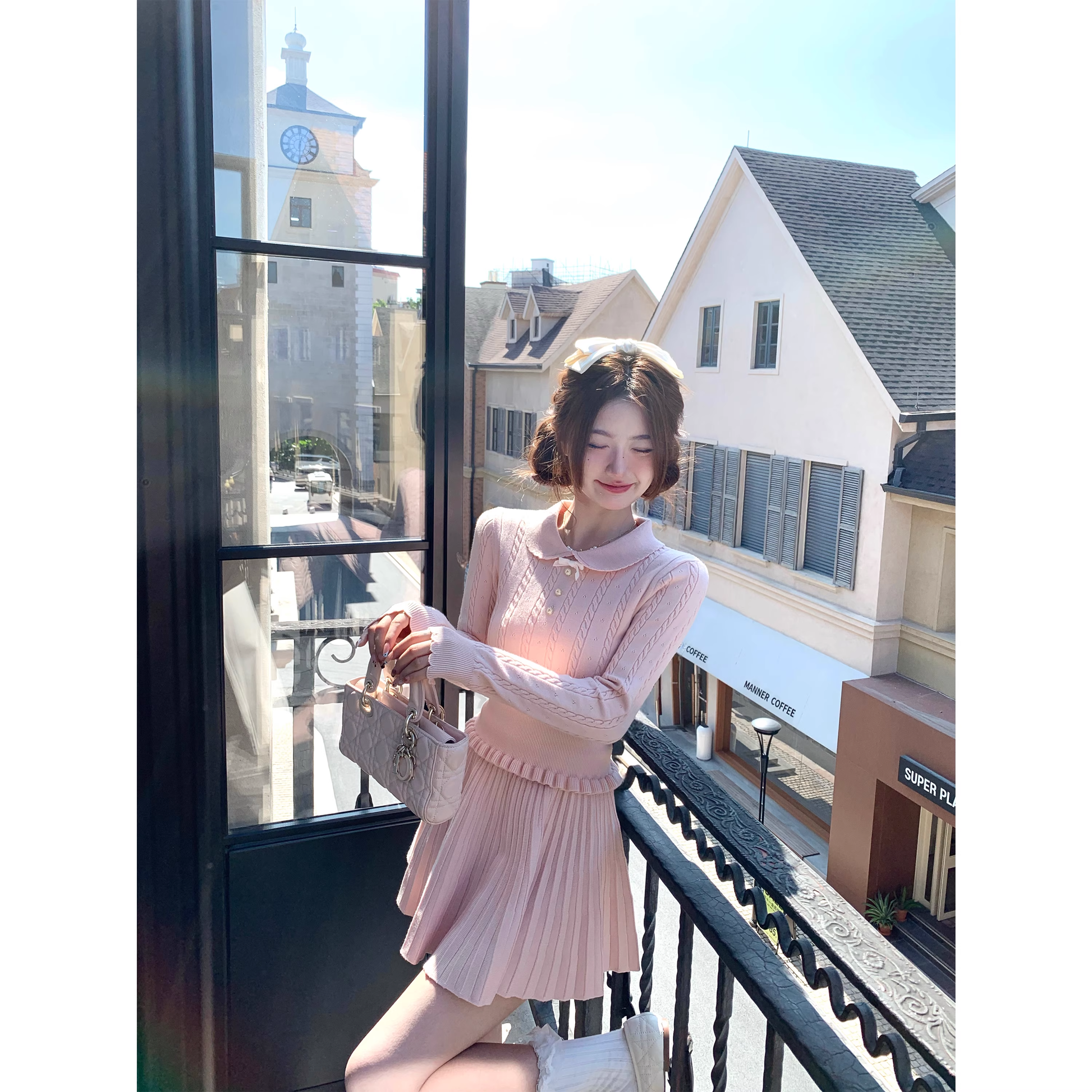 Pink long-sleeved knit sweater and skirt set - super cute autumn/winter outfit A06