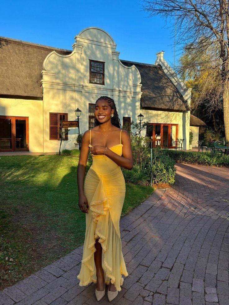Romantic Ruffle Ruched High Low Maxi Dress Charming Evening Party Dress fg7758