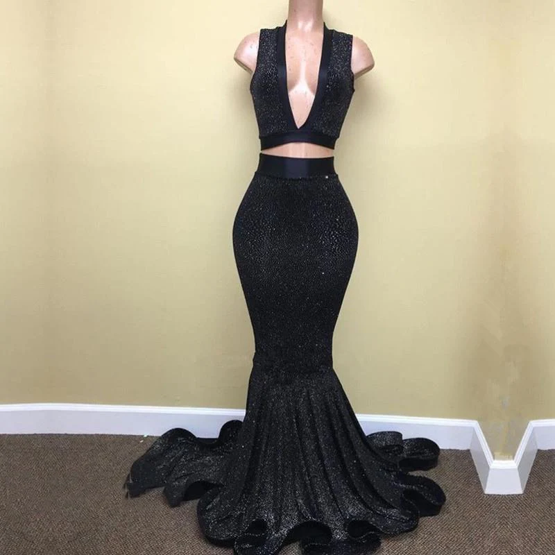 Sexy Mermaid Black V Neck Two Pieces Sequence Long Prom Dresses fg1885