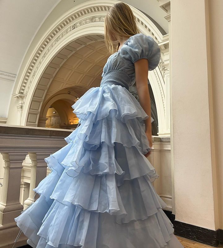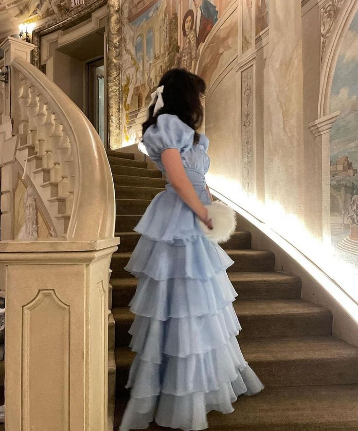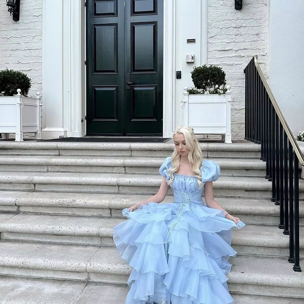 Sky Blue Tiered Skirt Prom Dress Puff Short Sleeves Formal Party Evening Gown fg7259