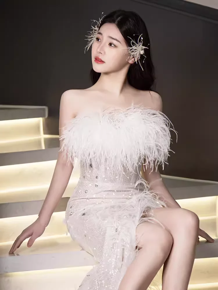 Mermaid Strapless Sequin Beads Long Evening Dress Slit Prom Dresses With Feathers fg8585