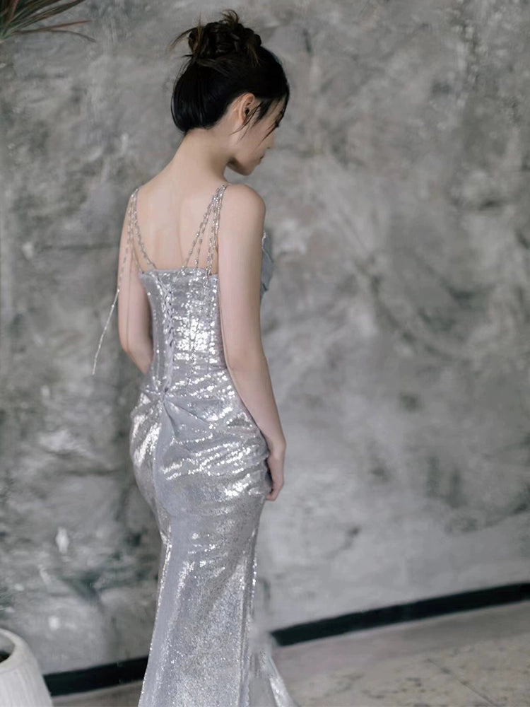 Silver Sequin Mermaid Long Prom Dress Sexy Evening Dresses fg7666