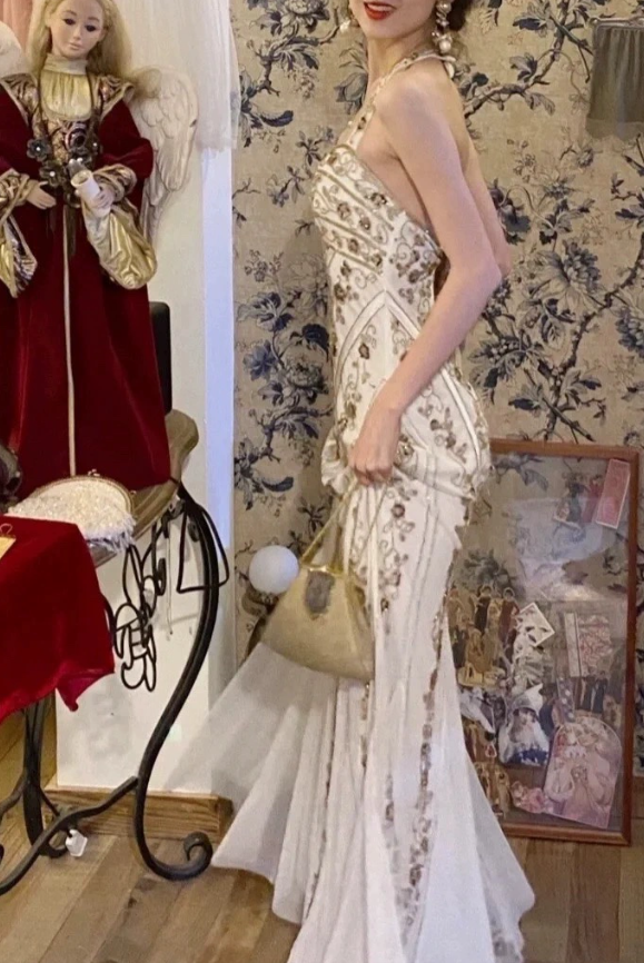 White Mermaid Long Prom Dress Beaded Vintage Evening Dress fg8255